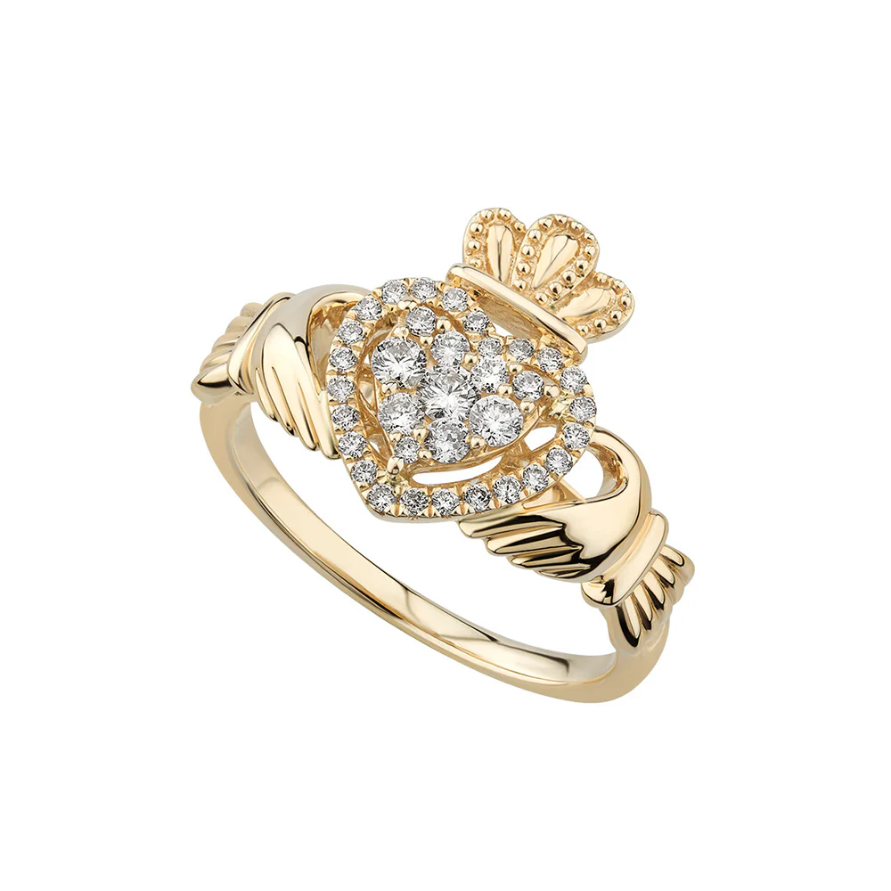 This eye catching diamond and yellow gold Claddagh ring is the one for you.
