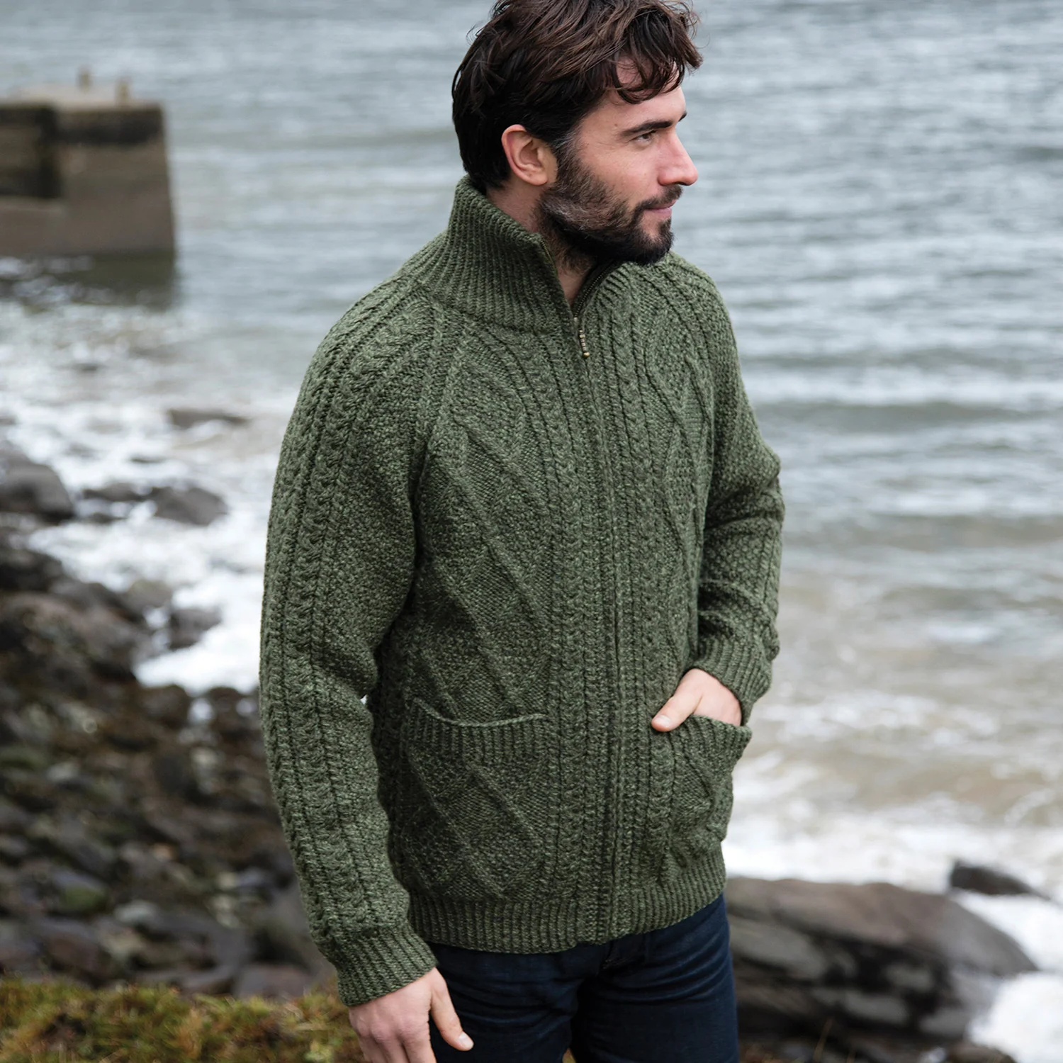 Hand knit in Ireland, Aran Woollen Mills have designed this hand knit zip cardigan in a unisex style.