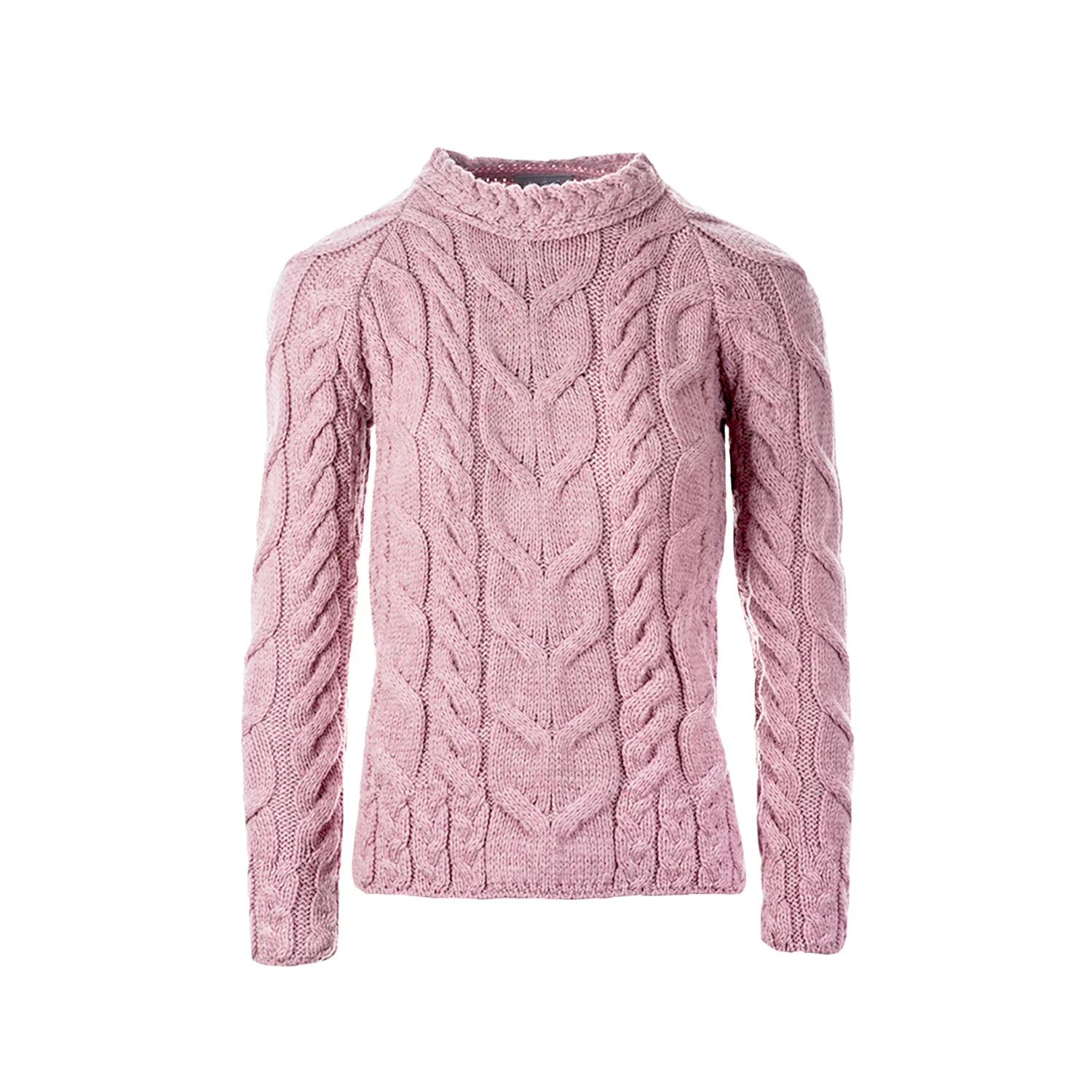 The dusty rose pink colour adds a feminine touch to the original aran sweater design.